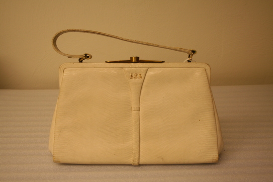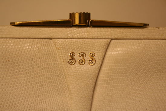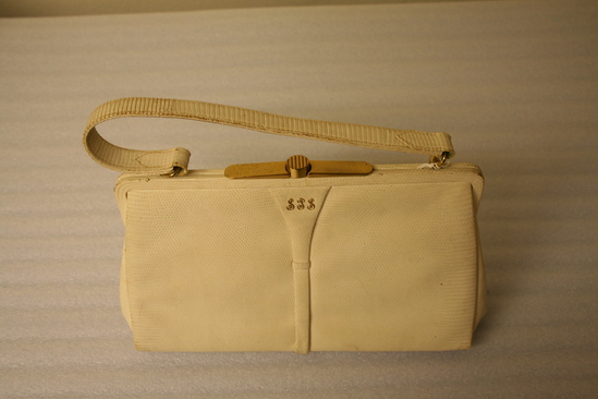 White leather purse, possibly some type of snake skin. Gold metal clasp at top which allows purse to bend open. White leather handle attached by gold rings to top of purse. Handle 14" long from end to end. Front of purse monogrammed with gold letters "SPS" Interior of purse lined with brown suede. Three pockets on interior - one with a zipper closure - all lined with white silk.