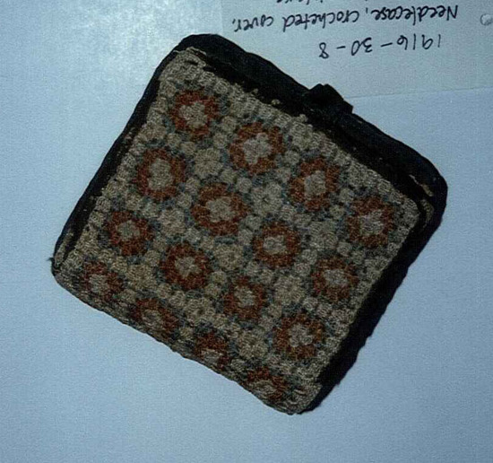 Flat square stuffed and covered with green silk. The top is a separate flap, made of crocheted squares in red, white, and blue, which continues on the bottom. Under the flap are two pieces of wool for holding needles. Under this, attached to to cushion by green silk tape, is a watercolor beehive on paper. Probably done by a student of the Litchfield Female Academy.
