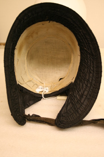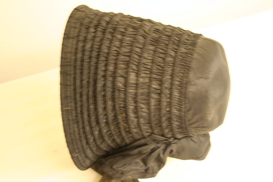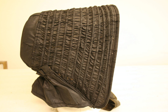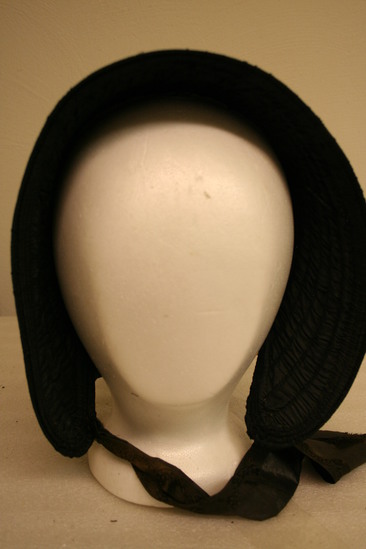 Black shirred bonnet; brim longer than crown; black silk bavolet attached bellow crown and down sides; one black silk ribbon with small flower design on left side (when facing front)