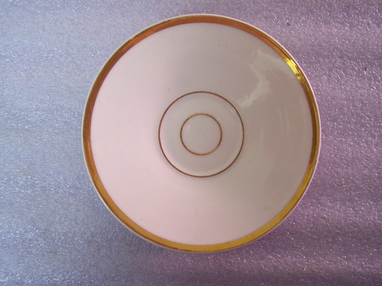 White saucer with a wide, gilt band on its edge, and two small thin circles in the center. Center is slightly indented for a teacup.