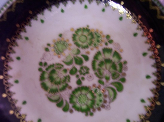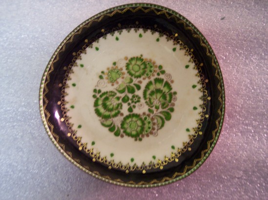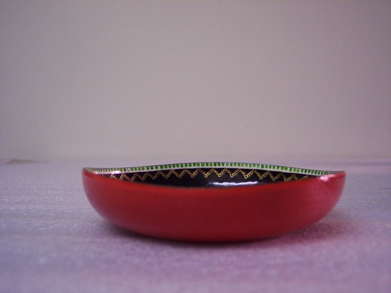 Enamel over copper ashtray, circular, high rim, exterior of deep orange/red, interior green and gold flowers on white enamel ground with large black border with various gold, green and white decorative bands. Donor said a favorite of his wife.