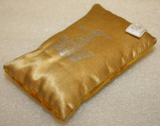 Gold/yellow colored hat smoother, shaped like a small pillow. Velvet on one side and silk on the other. Maker's label embossed in silver on silk side.