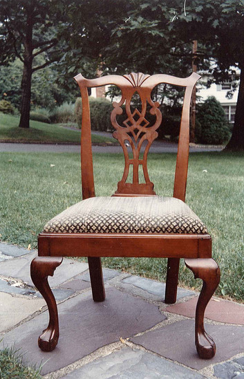 Cherry or mahogany Chippendale style side chiar with slip seats covered in dark green and yellow piled fabric. One of a pair. Front cabriole legs ending in ball and claw feet. Raked and chamfered back legs. Flared uprights supporting yoke top rail with turned back scroll ends and central shell design. Figured and pierced splat with diamond center pattern. See also accession #1984-13-1 a,b for another pair of chairs, identical
