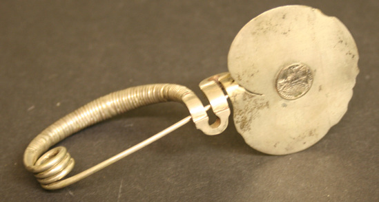 Copy of a Greek pin found in Rome Italy. The handle is an arch of silver rings with a large coil spring at one end. The spring continues as a long pin which rests on a flat leaf-shaped piece at other end of handle. Small Greek coin inserted in center of leaf.