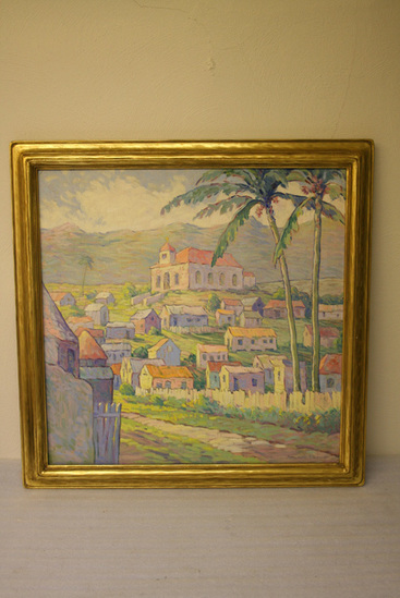 Oil on canvas landscape painting of a village in St. Thomas, Virgin Islands, church on top of hill with houses scattered below, mountains in background, two palm trees in right foreground. Label: "French village, St. Thomas, Virgin Islands. A little group of French settled here & always stayed together though island was Danish and now American." Signed lower right: "ADELAIDE DEMING"
