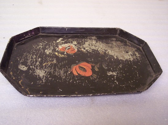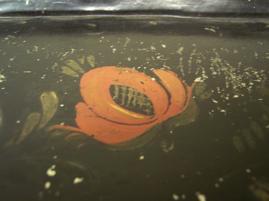 Oblong base with two straight sides flared out, ends rounded and curved outward. Gold line around inside bottom. Straight slanted sides with red and yellow border of leaf stylized decoration. Ends with red flowers and green leaves on white background band following curved top with pendant yellow leaf decoration.