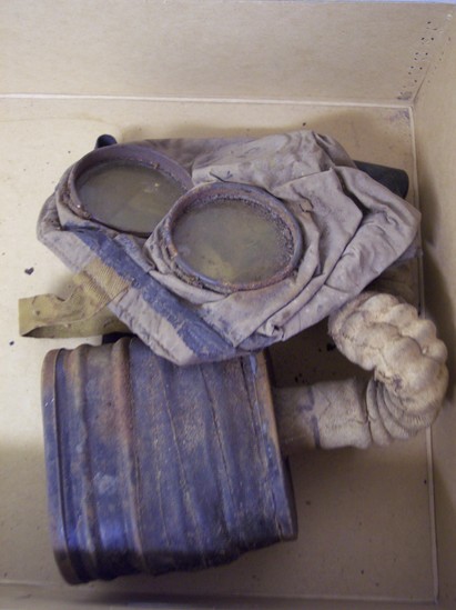 Gas mask, World War I era. Plastic face mask with head straps attached, metal air filter, and cloth-covered breathing hose.