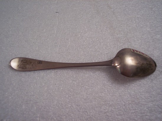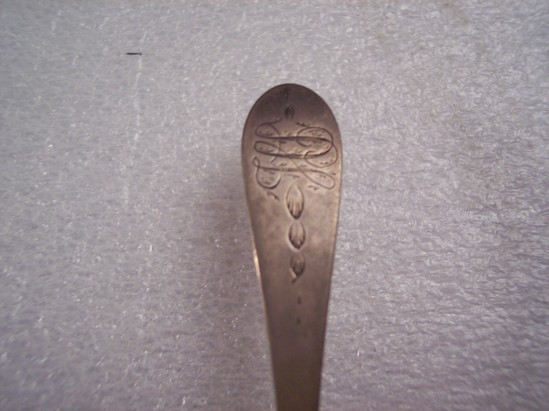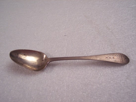 Oval bowl, regular handle with "HS" engraved on front of handle surrounded by husk swag. Hallmark on back of spoon "EB" in rectangle