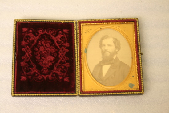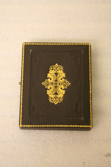 Leather bound case, jappened black. Stamped design on back. Papier mache panel of floral decoration with mother of pearl on front. Interior lined with cut red velvet. Daguerreotype inside of case of William R. Lord, son of Erastus and Charlotte Lord