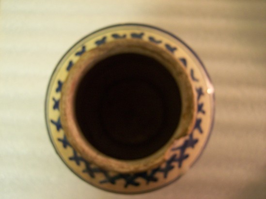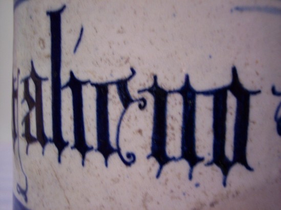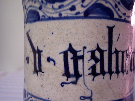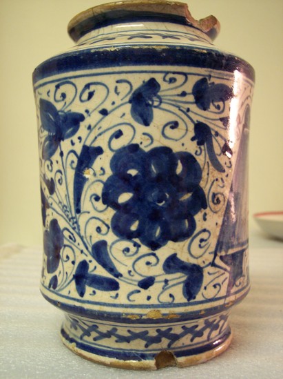 Unglazed base with sides flaring out to straight, round sides, and then flaring into slightly flared lip at the top. Geometric and floral-based designs in blue glaze on white. Large ribbon panel in blue with "[d'Galinuo]" on side. Tin-glazed? Very thin colored glaze inside. Possibly missing a top. Doctor's gallipot.