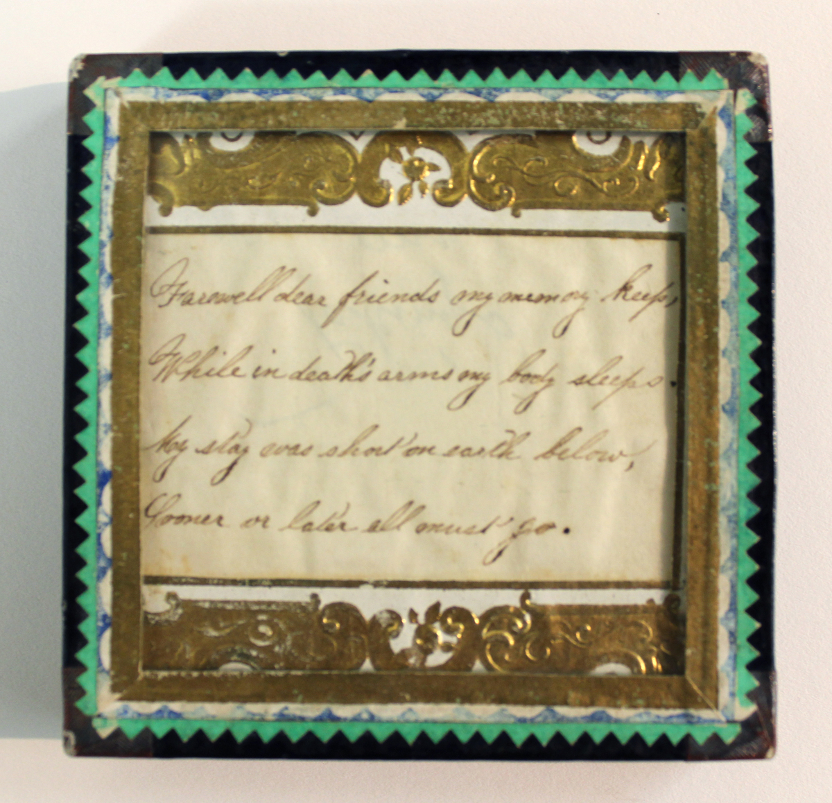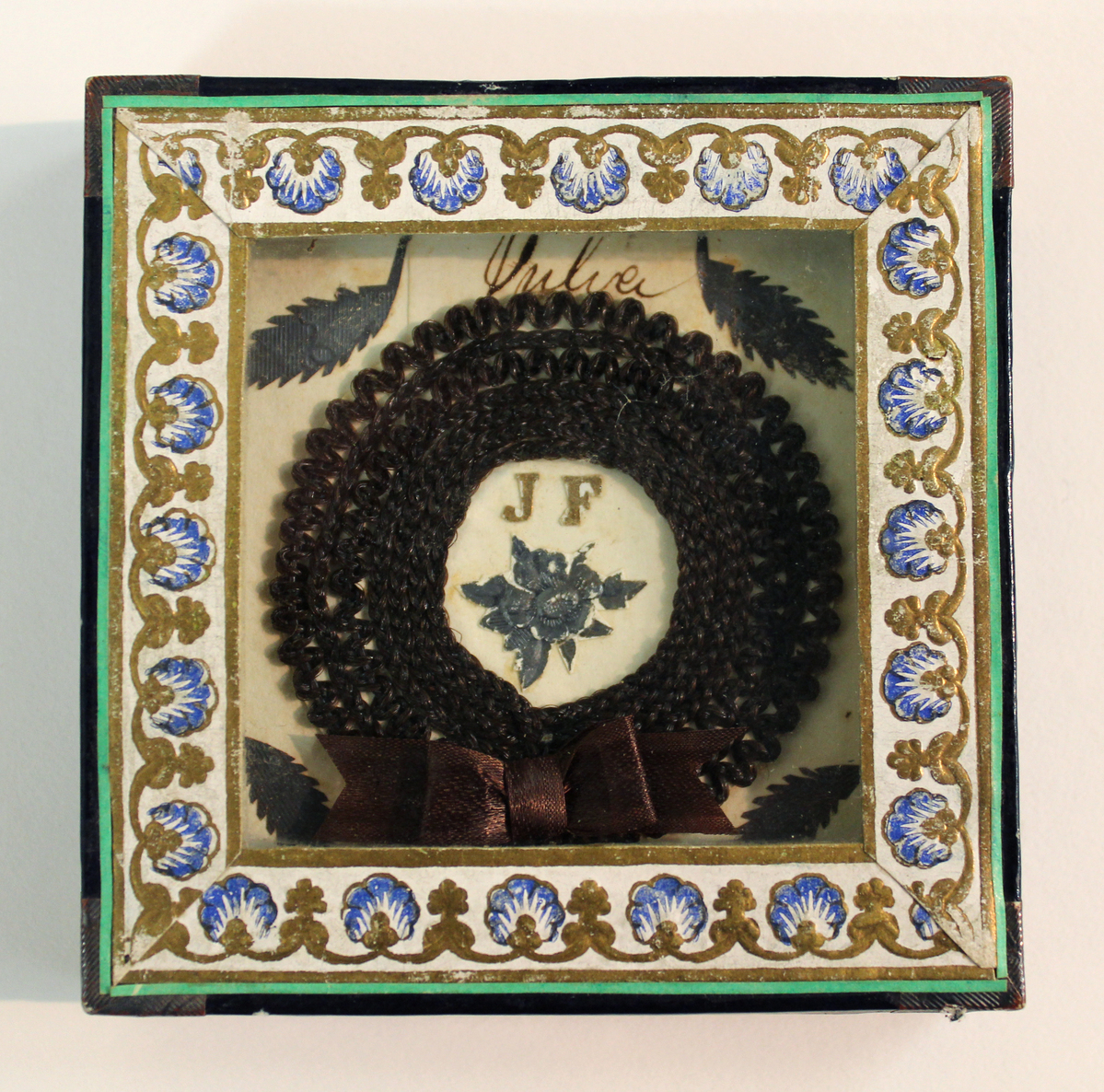 Circle of partly braided human hair with brown, silk bow encased in box with glass on both sides. Poem on reverse. Passe-partout is colored and embossed paper. "Julia" written over circle and initials "J.F." in center.
