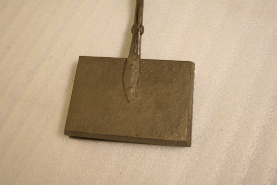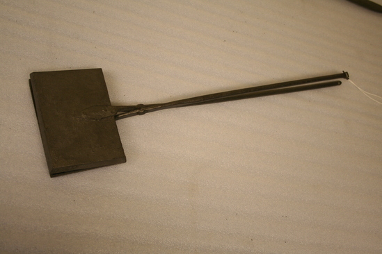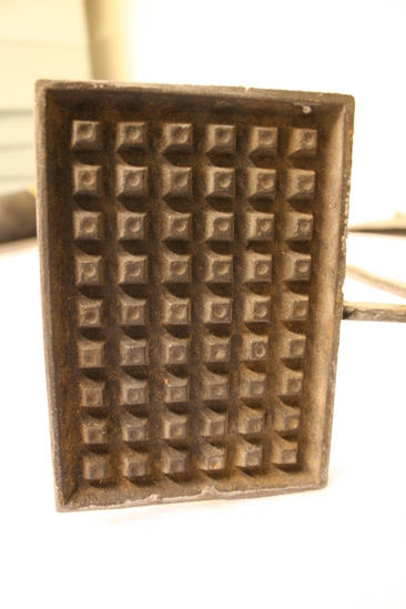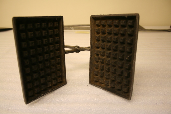 Long handled grid pattern waffle iron. Grid pattern waffle pans oblong on ends of round shaft handles with hinge; one end tear drop knob and other flat loop with closing wire