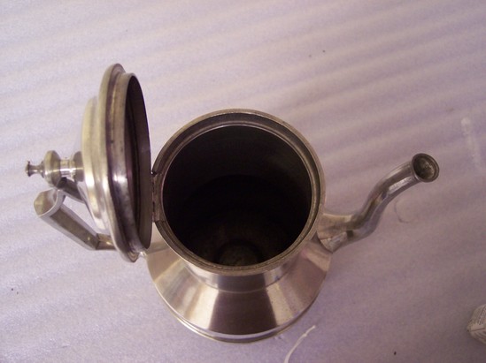 Tall, fancy gothic handle, high paneled spout, wound base and sides with bands, sloping in at neck, high collar with step lip, cone top with knob finial. Belonged to Mrs. Henry Hutchins, mother of Rev. John Hutchins