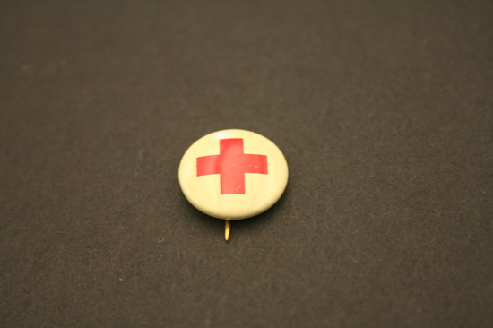 Small white pin with red cross in center. Stick pin on back which protrudes below base of pin. Pin round in shape.