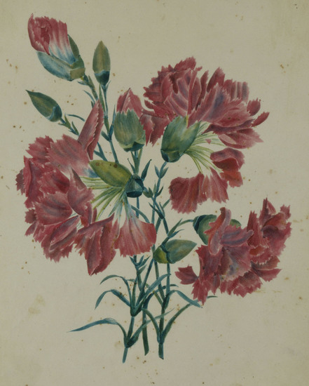 Watercolor painting of red carnations - green stem with leaves; three open red carnations pointing in different directions; One unopened carnation bud at top left of picture.