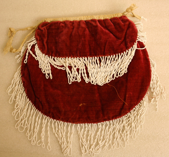 Red velvet purse, rounded shape. Rounded red velvet flap on two sides which mimics shape of purse. Bottom edge of purse and of flaps lined with loops of white beaded fringe that are each approximately 2" long. Top of purse lined with white silk with white silk tie strung through silk edge. Interior lined with white linen.