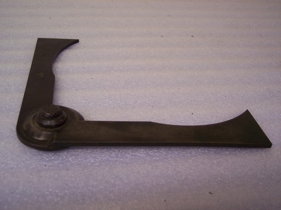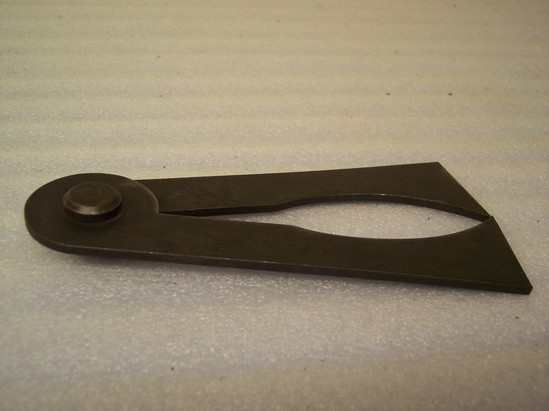 Iron calipers. Two pieces of thin iron, hinged on one end. Each piece has curved area on interior which would encircle a cannon ball to measure for correct size.