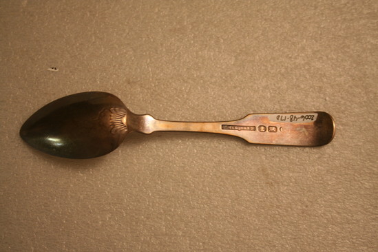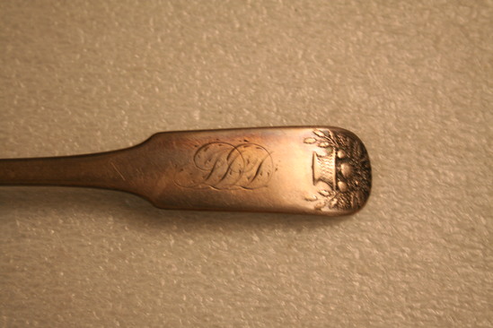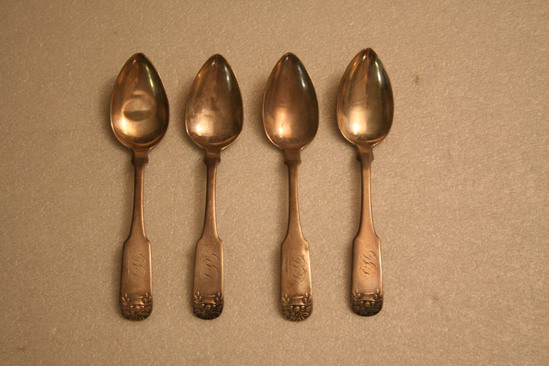 4 silver teaspoons, oval shaped bowl, pointed at end. "JDD" monogrammed at end of handle on front is script lettering. Basket overflowing with flowers raised at end of handle. Maker's mark "F. MARQUAND" stamped onto back of handle with three symbols. Shell design on base of bowl where bowl and handle meet