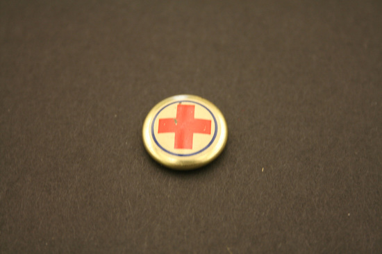 Small round metal pin. Gold border, white center with red cross in middle. Thin blue line around outside of white circle