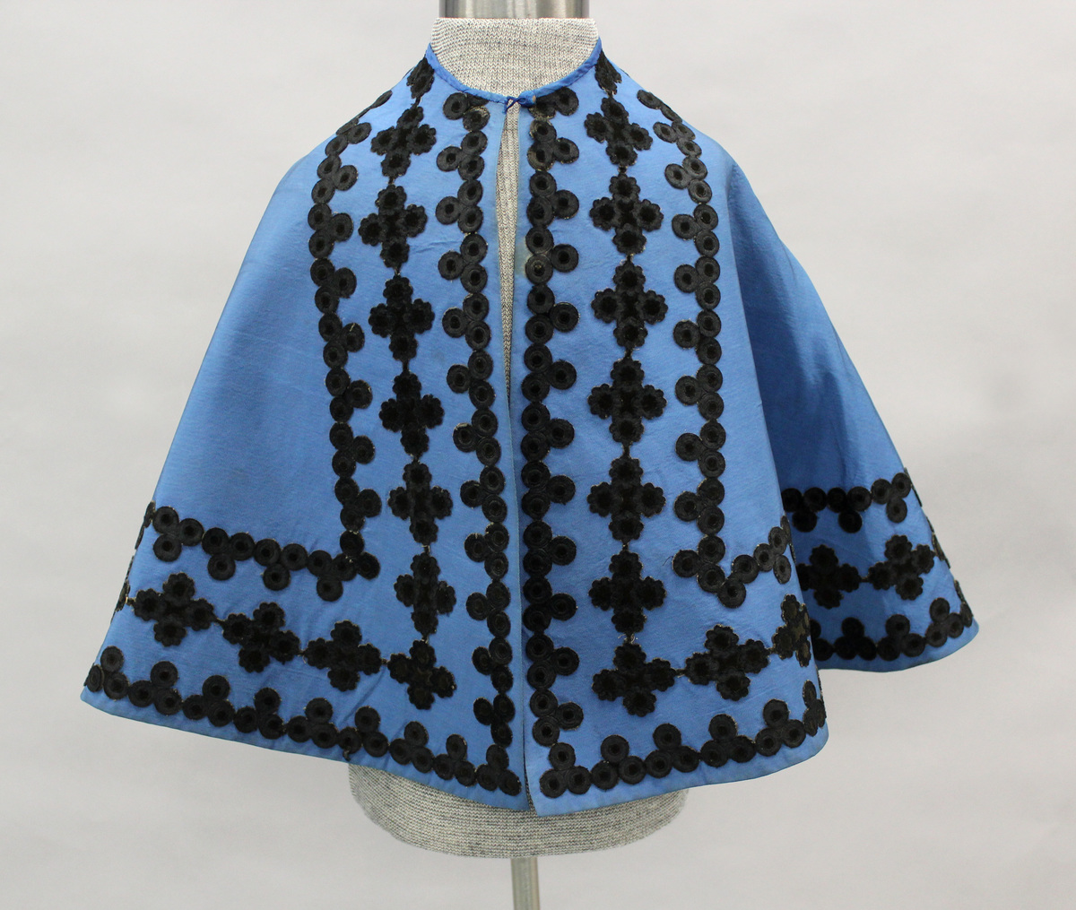 Blue silk taffeta child's cape with black velvet trim; semi-circular shape; blue silk taffeta lining; one small covered button at neck