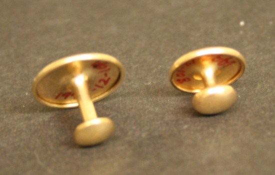 Two shirt studs of metal. Round with small post on one side which has small disk on other end. Both studs have round indention in center of stud. A slightly larger in diameter than B.