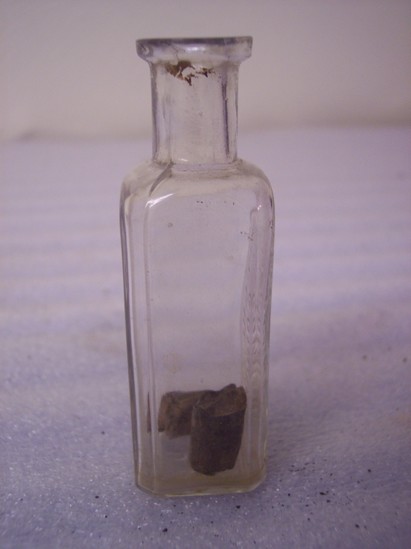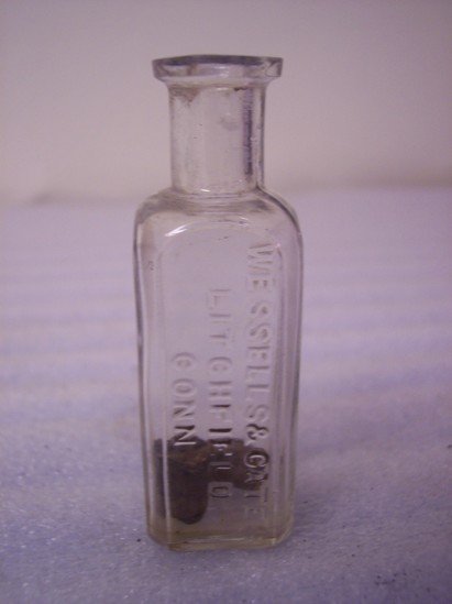 Pressed glass bottle, clear glass, square shoulder with bevelled corners. 3/4" neck, rim is flat. Impressed on one side of bottle "Wessell's & Gates/Litchfield/Conn" Impressed on bottom of bottle "WT&Co" with a backwards "R"