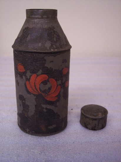 Cylindrical shape; black with orangefloral decoration. Slanted shoulder. Press-on cover 3/4" deep.