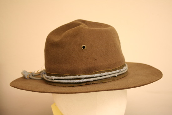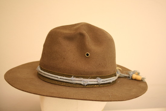Oval shape with tall rounded top crown and 3" wide; flat brim all the way around; olive green/brown ribbon around base of crown; in center of ribbon two light blue cords - knotted in back with wooden togels on end of each cord; no lining interior but brown textured band