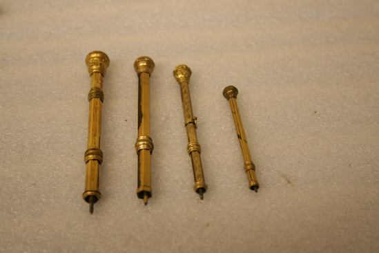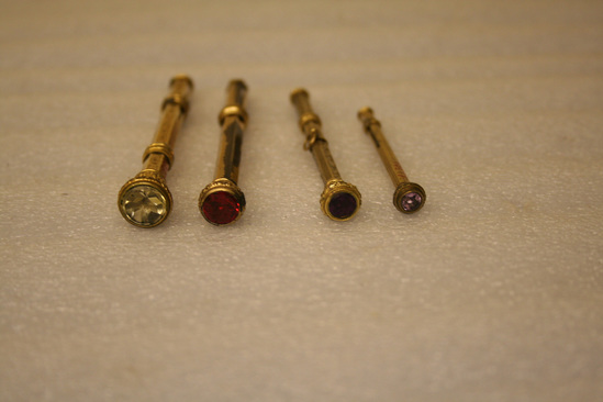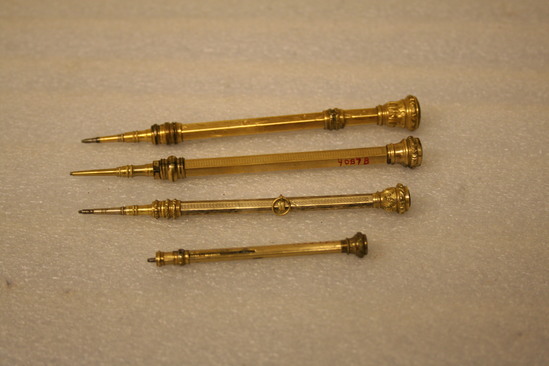 Four mechanical pencils. Gold metal cases, with two raised bands on each shaft. The bands when pushed together extend the pencil tip out enabling user to right. When bands are pulled apart the tip is withdrawn into the shaft. Each pencil is topped with a glass crystal - clear, red, black and purple.
