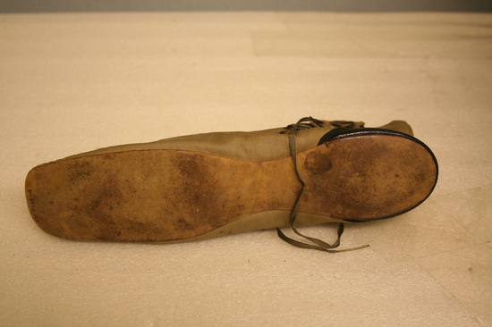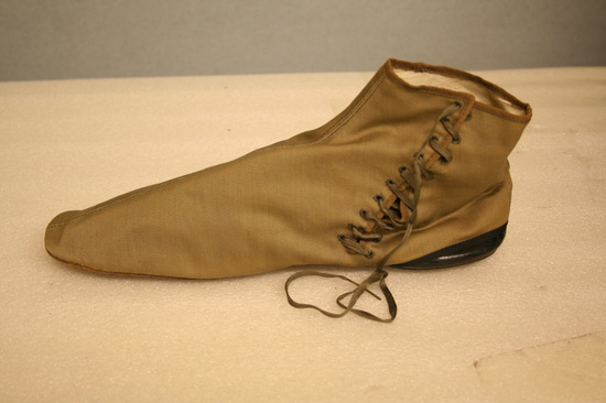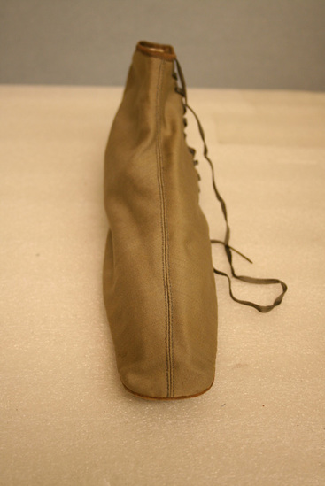 Gray or drab green gaiters; lace up side with gray laces; tongue near laces; inside lined with white cloth; soles of leather; above each heel is a trim of black patent leather, rounded squarish toe