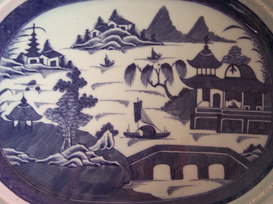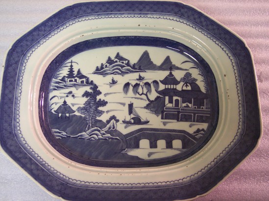 Blue border with river scene in circle. Octagonal shape with in-punched corners. Underneath--unglazed base, floral sprays on sides.
