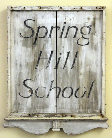 Wooden sign, painted white, body of sign is shaped like a rectangle, fluted pilasters at sides and scrolled pediment at bottom (missing from top) with natural wood finial. "Spring Hill School" in black script lettering.