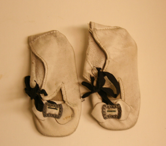 White kid Mary Jane doll shoes - paste buckle, black cotton tie closure