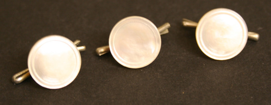 3 vest buttons. Round mother of pearl buttons with metal backs and loops. Metal bar on back.