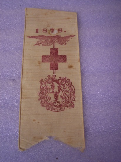 G.A.R. white silk ribbon. Printed in red "1878" underneath image of eagle holding a flag in it's talons; underneath this image is a large red cross; and underneath this is image of seal of Connecticut
