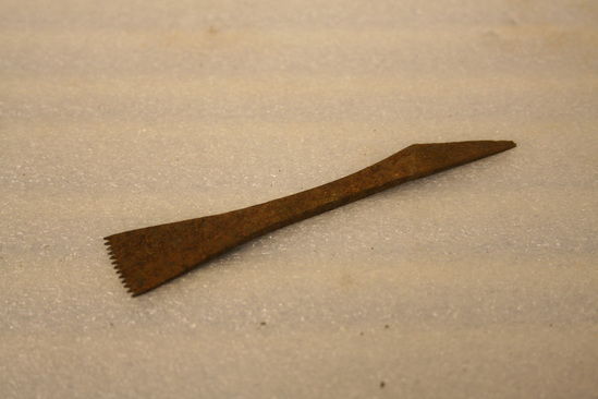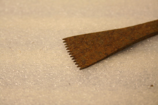 Type of cobbler's tool bit. Flat, one end broken, head of bit has one row of small pointy teeth