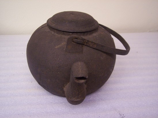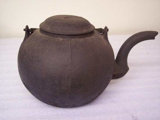 Fitted round bottom for stove hole; straight sides with cast line at shoulder; rounded top with slight lip for top flat domed with side knob fitting into round hole on shoulder two bails coming up for handle with flat top; flowing curved spout.
