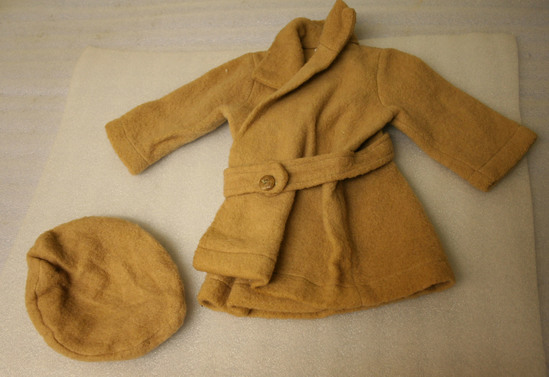 A - Coat - tan wool doll's coat, raglan sleeve and cut with norfolk belt fastened inf ront with snap, knee length, notched collar, stitched band at hem and sleeve, unlined B - Hat - Tam-o-shanter style circular doll's hat, crown and border with rolled stitched band