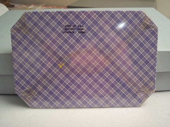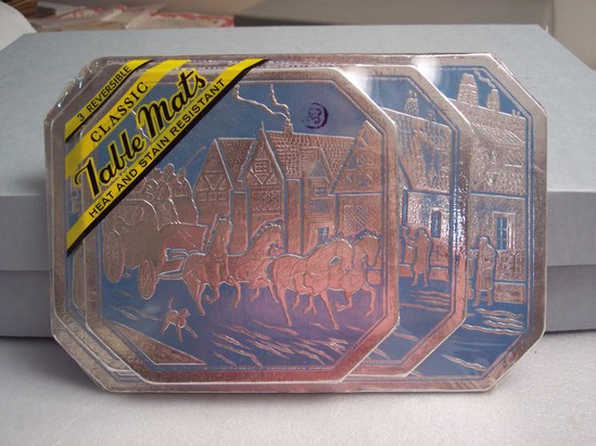 Set of three table mats. Largest measures 9 3/4" x 6 5/8"; medium measures 8 1/8" x 6 1/8"; smallest measures 6" x 6". All three have identical scene of stage coach riding through a town. Done in relief, recessed background blue; stagecoach, buildings and other details raised in silver metal. Back of each mat done in blue and white plaid. Still packaged, wrapped in original plastic. Label on front is plastic reads "3 Reversible/Classic/Table Mats/Heat and Stain Resistant"
