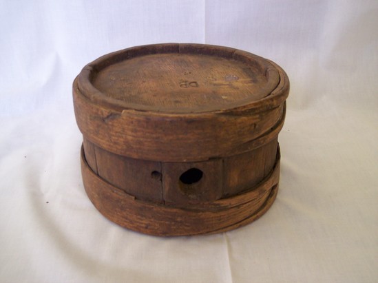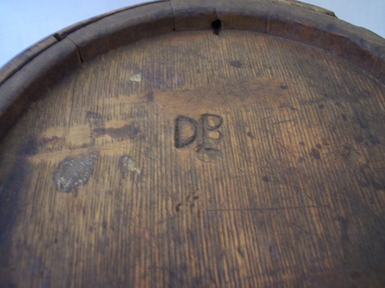 Made of 9 pieces of curved oak butted together into which the two round oak sides have been fitted into grooves. It is bounded with two hickory bands 1 1/2" wide top and bottom which are spliced with large tongues and grooves. One side piece has square block in center with 1" holes drilled through it which has a worn thread for a plug. Has shims. Belonged to George Cook. Scratched on one end "C B 1763" "S B" "P B 1765" on the reverse side "D B"