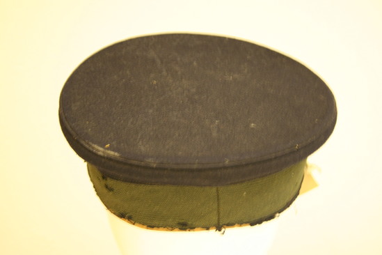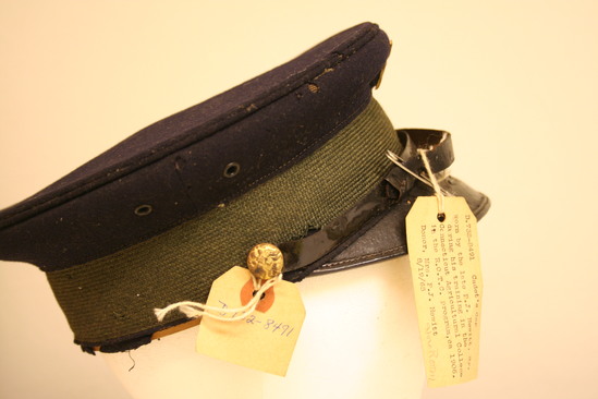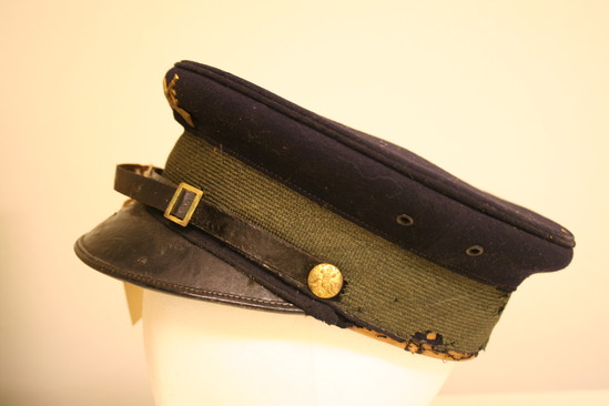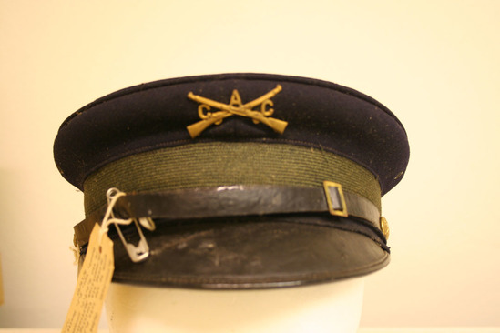 Dark blue wool cap with straight sides and flat top wider than the base; green ribbon around base; in front, an emblem with two guns crossed and the letters "CAC"; a strap around the front of black leather attached with two buttons with eagle on them; a black visor in front, turned down; interior black cotton lilning and brown band