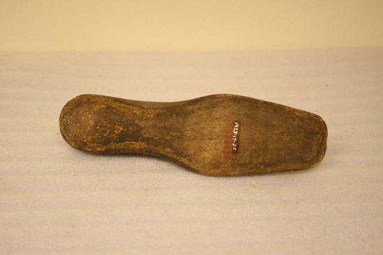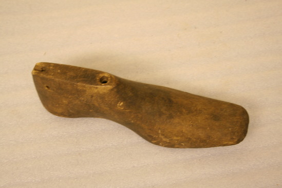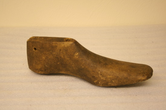 Adult size shoe last. Square shaped toe. Hole drilled though top of heel. Hole drilled into top of last.