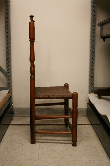 Turned maple side chair, straight back with turned side posts with finials, saddle top or crest rail, 4 reeded banisters, turned front legs, two turned front stretchers, two side and one back plain stretcher, splint seat.