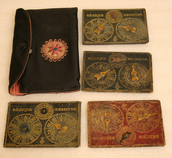 Four counters for Bezique card game. Counters are gold tooled leather with dials on faces, two green, one red and black paper with Bezique score on back, shaped wooden arrows on dish. All contained in black silk purse with pink lining. Embroidery on front in arch design