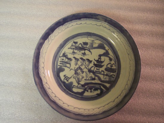Deep plate. Blue and white river scene in the center with a solid blue rim.