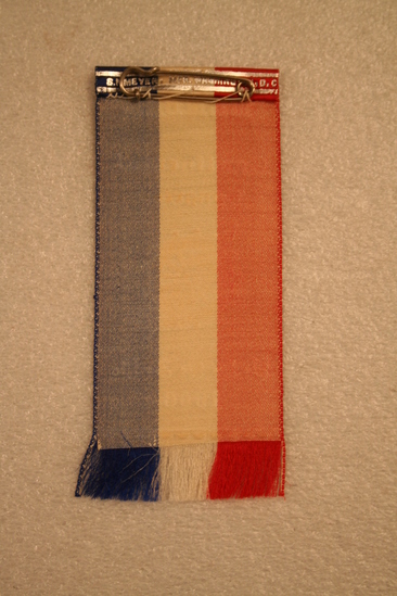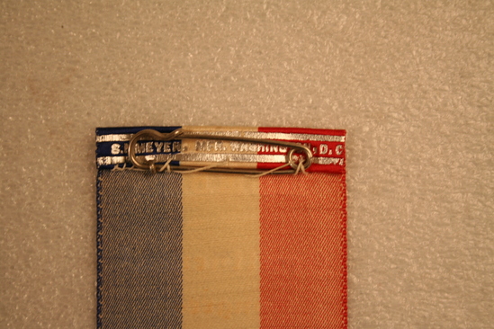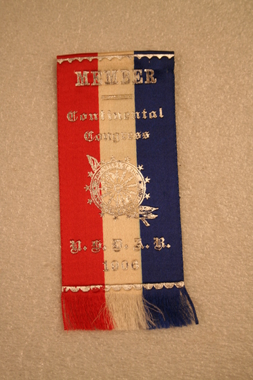 Badge - silk ribbon - red, white and blue verticle strips down back. Fringe on bottom. Symbol for Daughters of the American Revolution in center in silver. Printed above in silver "MEMBER/Continental/Congress" and below "U.S.D.A.R/1906" Silver pin on back and manufacturer information on back along top seam. Printed in silver "S.N. Meyer, MFR Washington D.C"