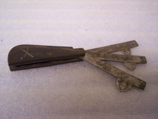 Three lancets of various sizes set in a bone handle with a brass backing. Fold into handle. Used for bleeding animals.