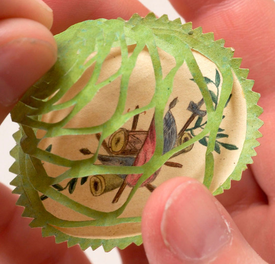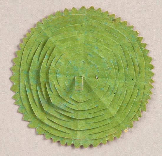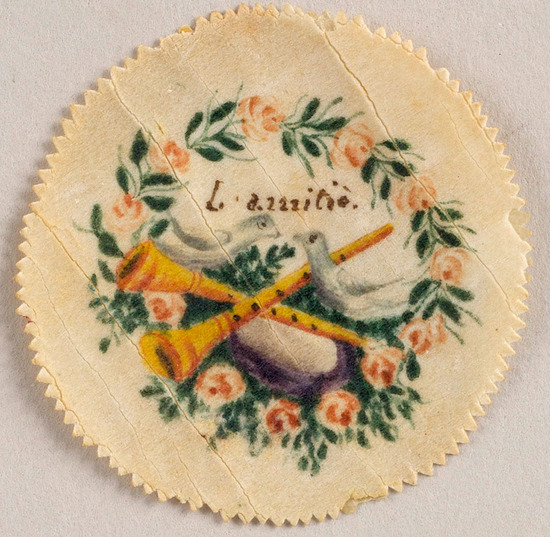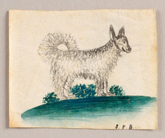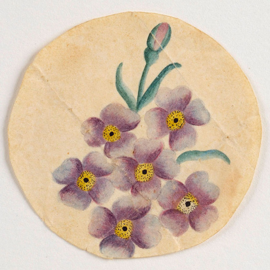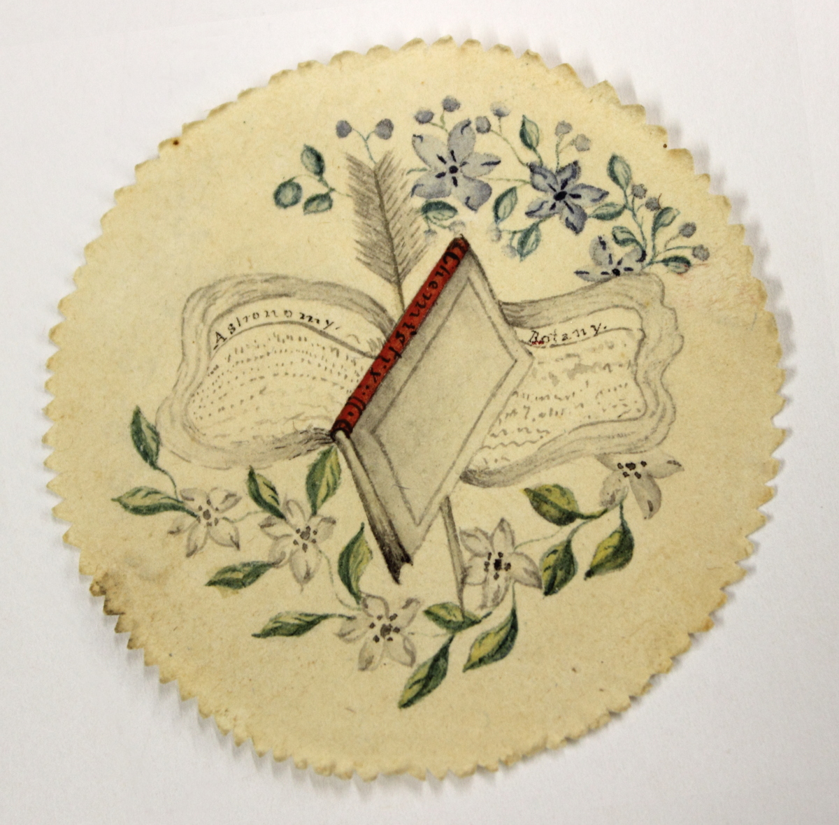 A. Watercolor on paper, pink edged book with red spine "Chemistry" and open paper with "Astronomy" and "Botany", arrow through book and spray of blue and white flowers. B. Watercolor and pencil on paper of a goat with pointed ears and curled fuzzy tail, facing right, initials in lower right corner "J.P.B." C. Ink on paper "Accept this from/one who wishes to return thanks/for the kindnesses/received/from you." D. Watercolor on pasteboard, all over grey, sprig design with open sheet music "Alls Well" and "For God" with harp and trumpets surrounded by flowers and ribbons. E. Watercolor on paper of cluster of gentians with one bud. F. Ink on paper, "I have painted this watch paper/for Mr. Brace--mite he accept of it/as a trifling testimony of the regard/of---M A Bartlett---." G. Watercolor on paper of two flutes with doves, surrounded by a floral wreath. H. Watercolor on paper. Watch paper is concealed beneath a green paper that expands outward to reveal the painting underneath.