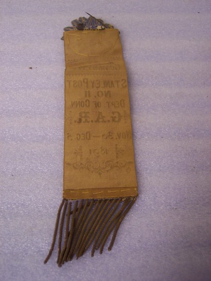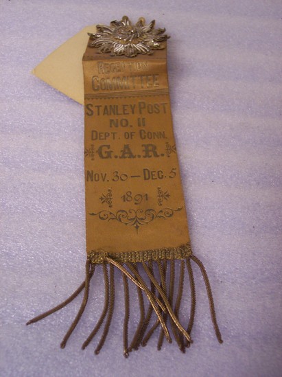 G.A.R rectangular, bronze colored ribbon. 14 pointed star at top of ribbon with gold sequins and silver metallic tubing. Printed on ribbon "RECEPTION COMMITTEE/STANLEY POST/NO. 11/DEPT OF CONN/G.A.R./NOV. 3 - DEC.5/1891" Gold metallic fringe at bottom of ribbon