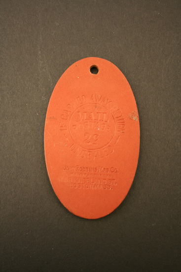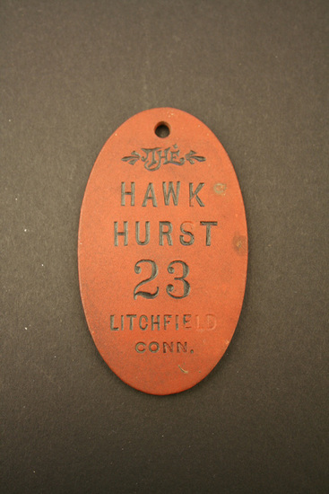 Oval leather hotel room key tag. Brown leather. In black lettering impressed into the leather on one side. "The/HAWK/HURST/23/Litchfield/CONN" On the back "If Carried Away Return/Unsealed/Mail Postage 2 (cents symbol)" Maker's information "John Robbins Mfg. Co./58 Kneeland St./Boston, Mass" Hole at top.